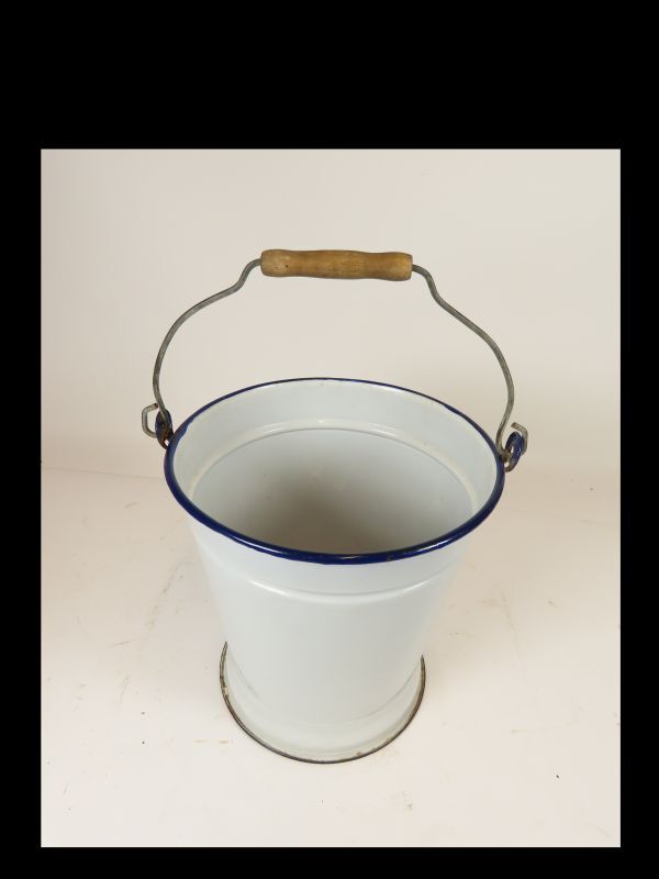 Witte email emmer met blauwe bovenrand en met hengsel met houten handvat.
