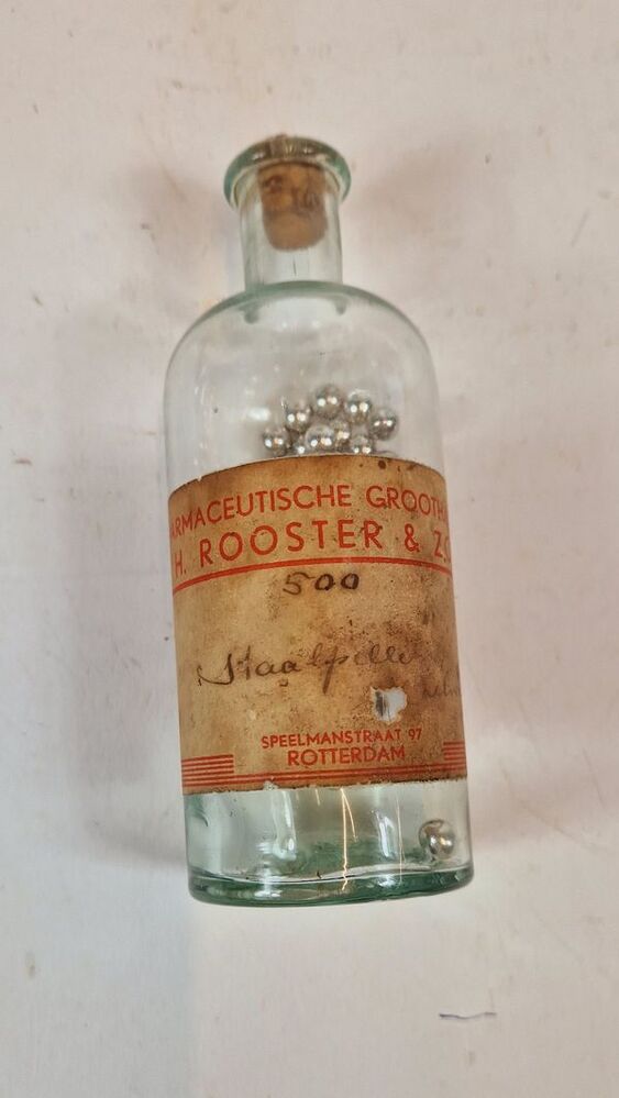 Glazen medicijnflesje van de Firma J.H. Rooster & Zoon, Speelmanstraat 97, Rotterdam. Het flesje bevat nog steeds een x aantal staalpillen. De Speelmanstraat is tijdens het bombardement van Rotterdam in 1940 geheel verwoest. Het etiket op het fles doet vermoeden dat dit medicijn dus voor 10 mei 1940 uitgereikt is.