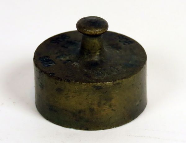 Koperen gewicht met knop, 10 DK. Op boven- en onderzijde ijkmerken.