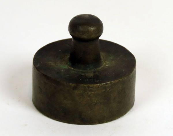 Koperen gewicht met knop, 10 DK. Op boven- en onderzijde ijkmerken.