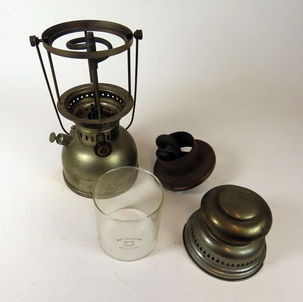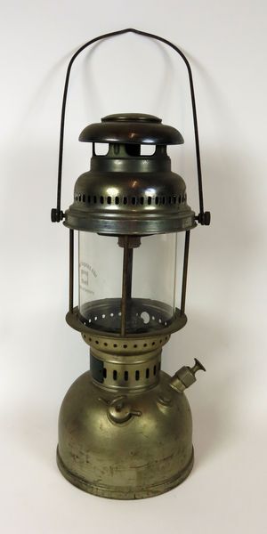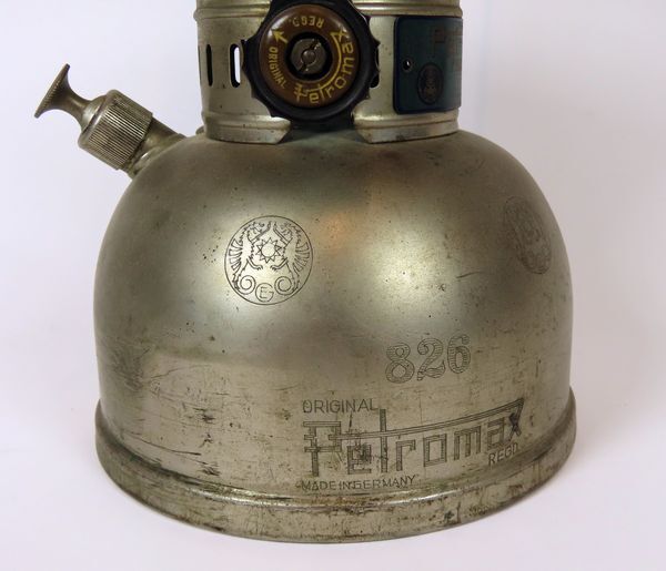 Petroleumvergasser lamp van het duitse merk Petromax met vast reservoir en ophangbeugel. De petroleum wordt in het reservoir met een pompje onder druk gezet, waardoor de vloeistof wordt verneveld in de verbrandingsruimte. Een gloeikous zorgt voor de ontbranding c.q. verlichting.