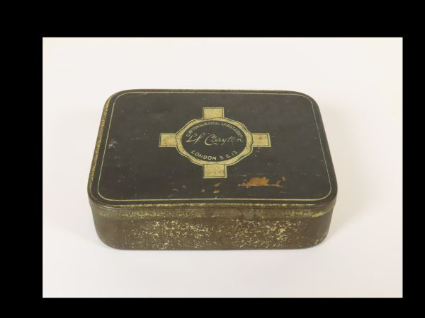 Goudkleurig blik met zwart deksel. Op het deksel een wit kruis met zegel van Clayton.