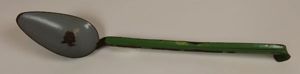 Geëmailleerde groene metalen pollepel voor het opscheppen van groenten. Het schepgedeelte heeft een druppelvorm en is grijs geëmailleerd. De steel is aan het eind omgebogen voor het ophangen.