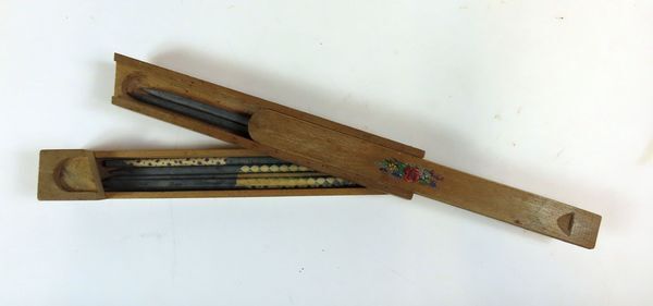 Houten griffeldoos , met uitschuifbare deksel,uiteen te schuiven in twee delen. De deksel is versierd met bloemen. Bevat 7 leistenen griffels deels met papier omhuld.