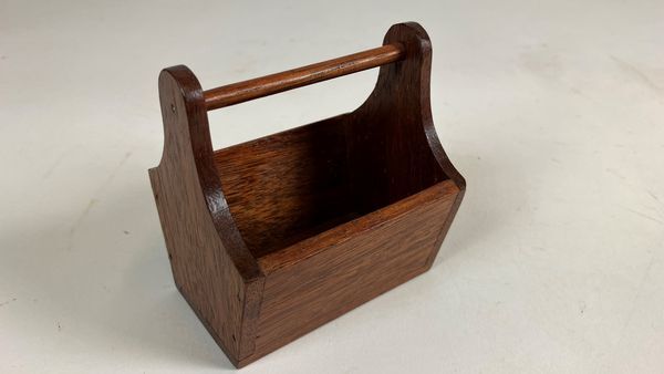 Bruin gelakt houten miniatuur van een krantenbak met handvat.