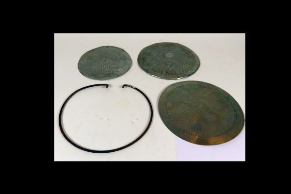 Drie zeven en een klemring van een melkzeef, ook wel teems genoemd, die op de melkbus wordt gezet voor het zeven van de melk direct na het melken.
