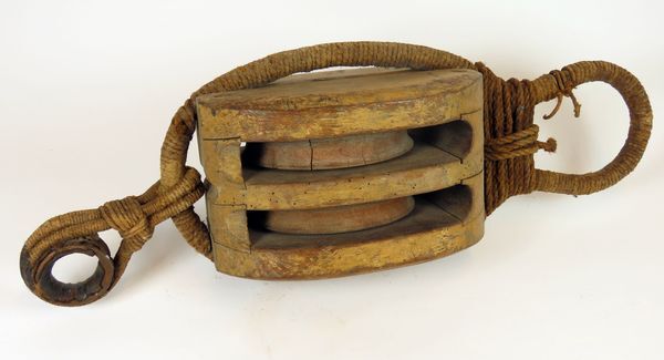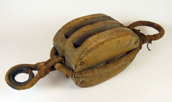 Groot houten twee-schijfs takelblok, ook wel aangeduid als haalblok. Om het blok is een met touw omwonden metalen band aangebracht. Aan de bovenzijde is de band met touw een stukje ingesnoerd en tot oog gevormd. Aan de onderzijde is met touw een metalen oog aangebracht. Het metalen oog heeft aan de buitenkant een leren bekleding ...