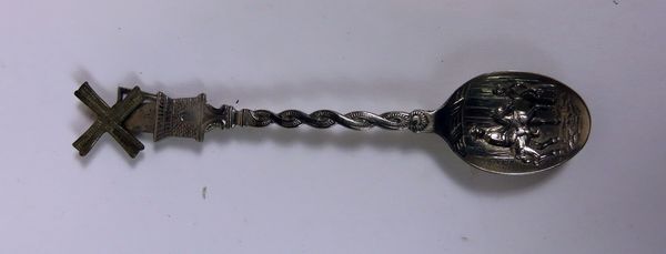 Lepel, zijnde een theelepel met gevlochten steel. Boven aan de steel een molen, in de lepel gestanst een toren en huis, waaronder ZIMMERTOREN LIER.