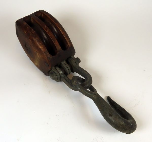 Houten tweeschijfs-takelblok. Onderaan bevindt zich een metalen oog met een pinsluiting en een metalen hijshaak. Een dergelijk takelblok werd o.m. gebruikt voor het ophalen van de netten.