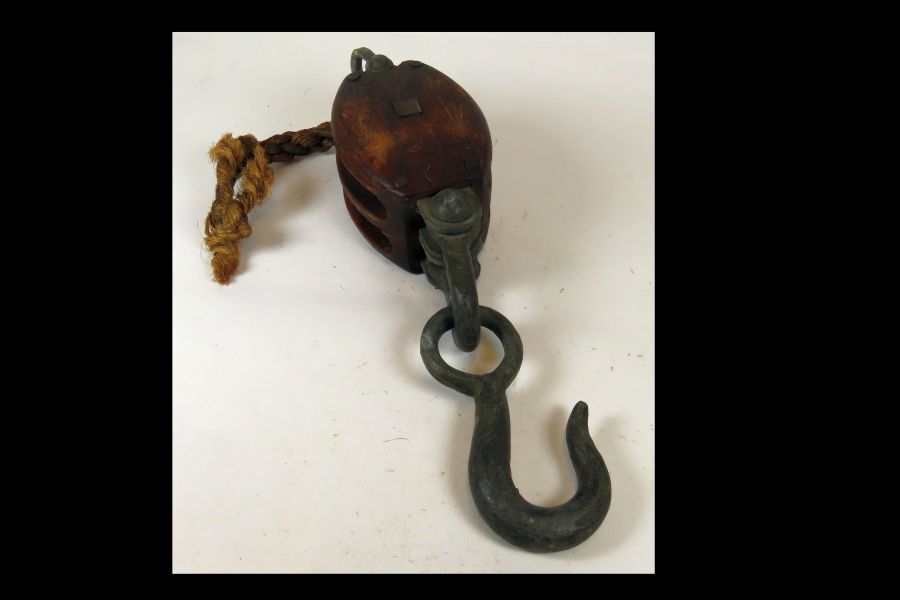 Houten tweeschijfs-takelblok. Bovenaan zit een metalen oog voor de bevestiging. Onderaan bevindt zich een metalen oog met pinsluiting en een metalen hijshaak.