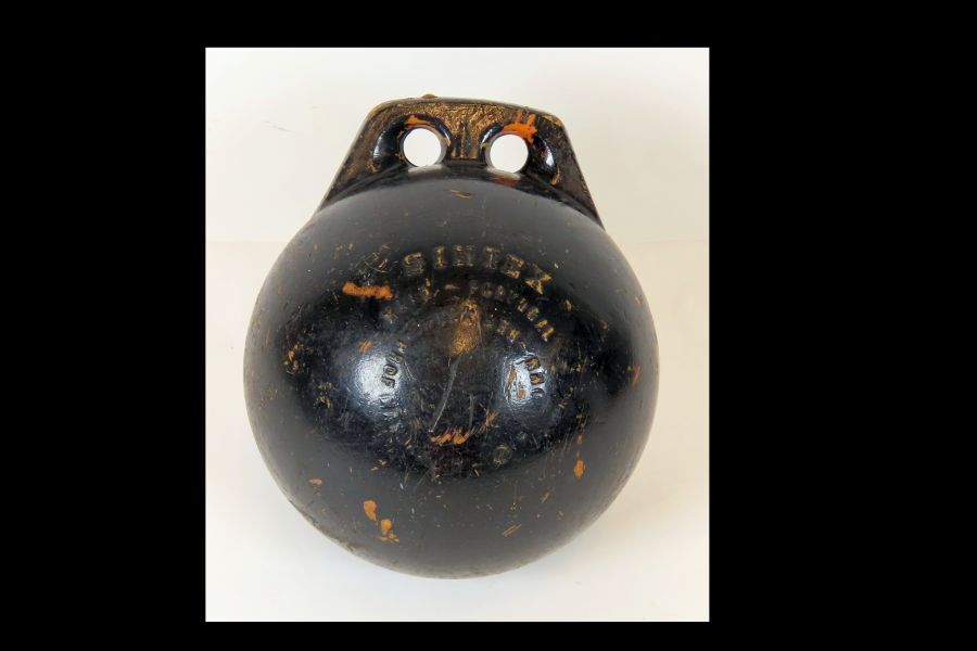 Zwart geverfde kunststof bol met aan de bovenzijde een platte uitstulping waarin twee gaten als handgreep zijn aangebracht. Het betreft hier een drijver voor een visnet.