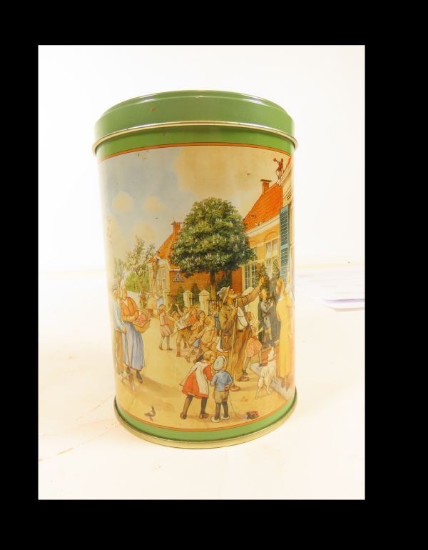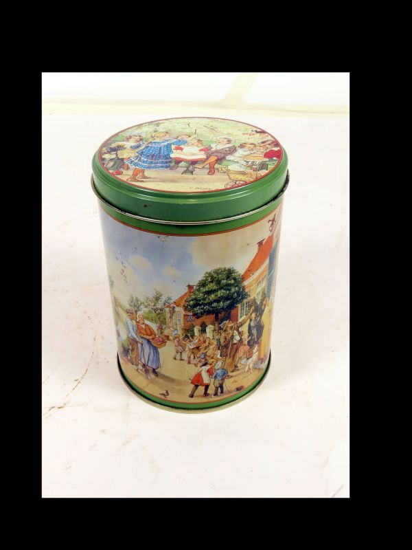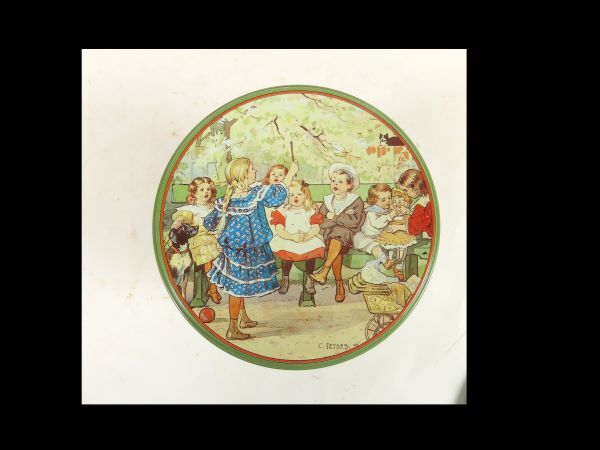 Rond koekblik uit de serie aap-noot-mies met afbeeldingen van C. Jetses, namelijk "De Verstelselplaat"en "De Zingende Kinderwereld".