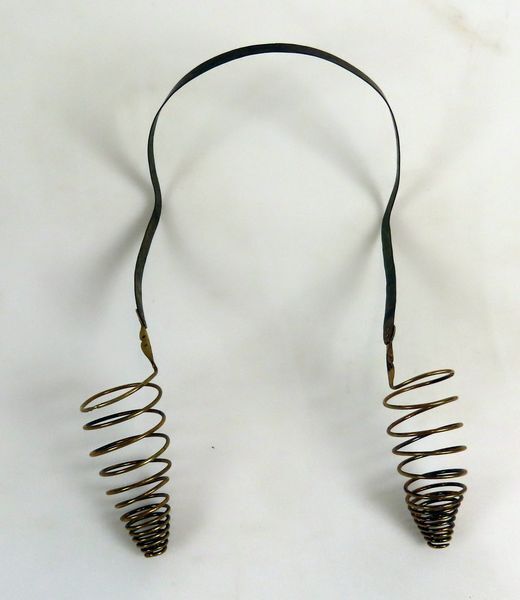 Koperen oorijzer, ooit gedragen door mevrouw Van der Wel-Schoon uit Zwartewaal. De gekrulde ijzers zijn met koperen nageltjes aan de draagband geklonken.