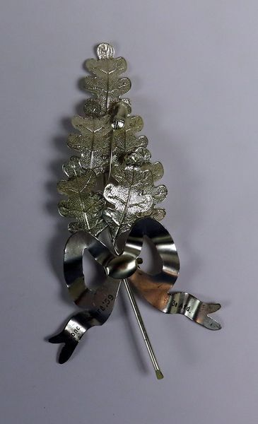Zilverkleurige prijstak (lauwertak). Aan de onderzijde een strik met op de linten de tekst Conc. Rozenburg '59, 3e Afd. Uitgereikt aan de Gemengde zangvereniging Excelsior, Zwartewaal.