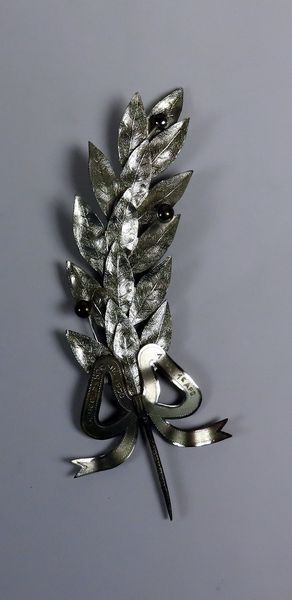 Zilverkleurige prijstak (lauwertak). Aan de onderzijde een strik met op de linten de tekst Concours Sprang 1950, 1E Pr. 1E Afd. Uitgereikt aan de Gemengde zangvereniging Excelsior, Zwartewaal.