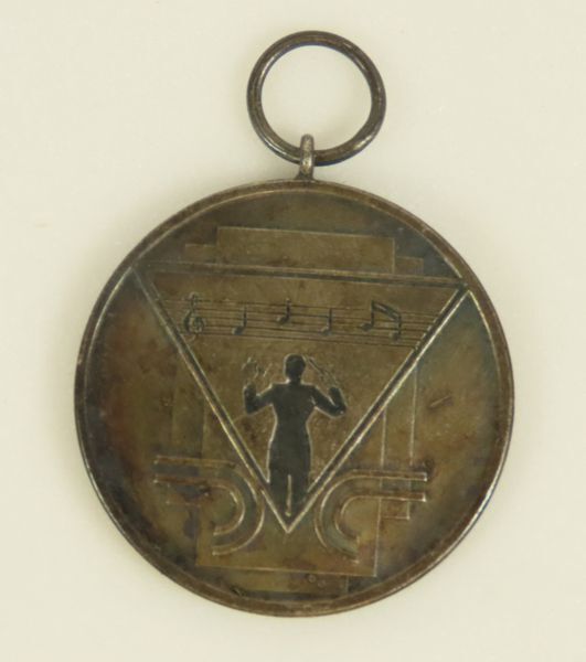 Ronde zilverkleurige metalen medaille met lintoog, uitgereikt in 1947 tijdens een zangconcours in M.dijk (Maasdijk?). Op de voorzijde is - in een op zijn punt staande driekhoek - een dirigent (op de rug gezien) afgebeeld met daarboven een notenbalk . Op de achterzijde een inscriptie in een rondlopende lauwerkrans. Uitgereikt aan Gemengde zangvereniging Excelsior, Zwartewaal.