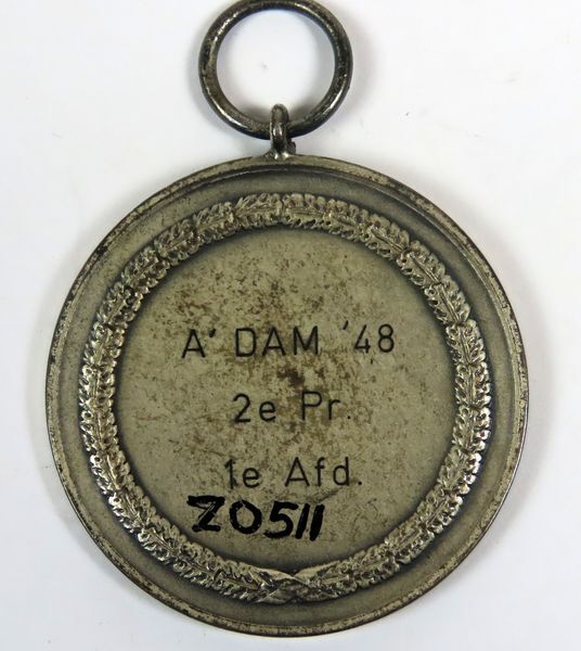 Ronde zilverkleurige metalen medaille met lintoog, uitgereikt als 2de prijs tijdens een zangconcours in Amsterdam in 1948. Op de voorzijde is in reliëf de afbeelding van een harp aangebracht met links en rechts een floraal motief. Op de achterzijde een inscriptie binnen een randversiering. Uitgereikt aan de Gemengde zanvereniging Excelsior, Zwartewaal.