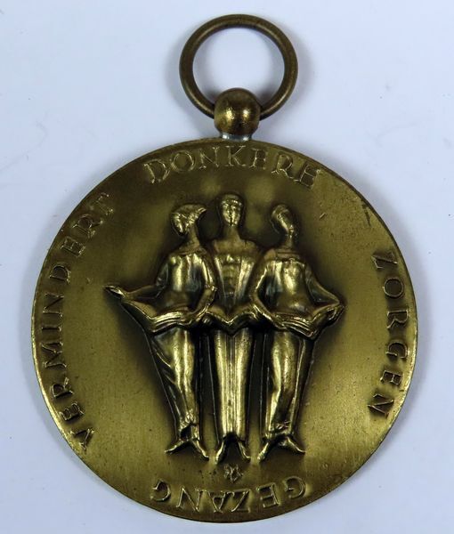 Ronde goudkleurige metalen medaille met lintoog, uitgereikt in 1954 als ereprijs tijdens het concours van de zangvereniging Amicitia in Lienden. Op de voorzijde is in reliëf de afbeelding aangebracht van een manspersoon geflankeerd door twee vrouwelijke personen. In rondschrift de tekst GEZANG VERMINDERT DONKERE ZORGEN. Op de achterzijde een inscriptie binnen een randversiering. Uitgereikt aan ...