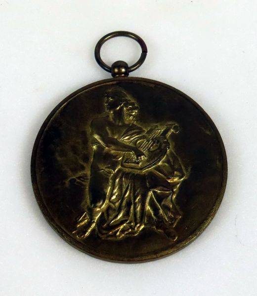 Ronde goudkleurige metalen medaille met lintoog, uitgereikt tijdens een zangconcours. Op de voorzijde is in reliëf een harpspelend vrouwspersoon (Grieks?) afgebeeld. Op de achterzijde een inscriptie in een rondlopende lauwerkrans. Uitgereikt aan Gemengde zangvereniging Excelsior, Zwartewaal.