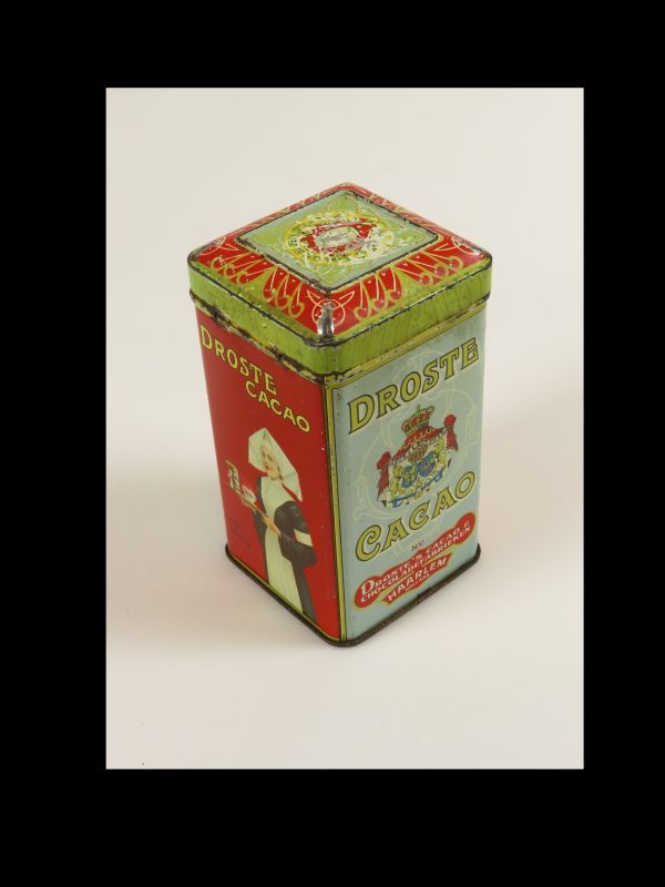 Vierkant bus met afgeronde hoeken en verhoogd deksel met firmanaam en productnaam op rood en lichtblauw fond. Op deksel en achterkant fabrieksmerk Droste, bestaande uit een schild met, in een ovaal, een boom met erin de letter "D". Op achterkant boven en onder fabrieksmerk zeven medaillons. Op voorkant nationaal wapen onder baldakijn. Op zijkanten een ...