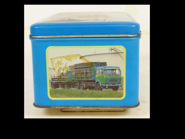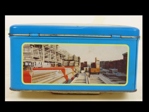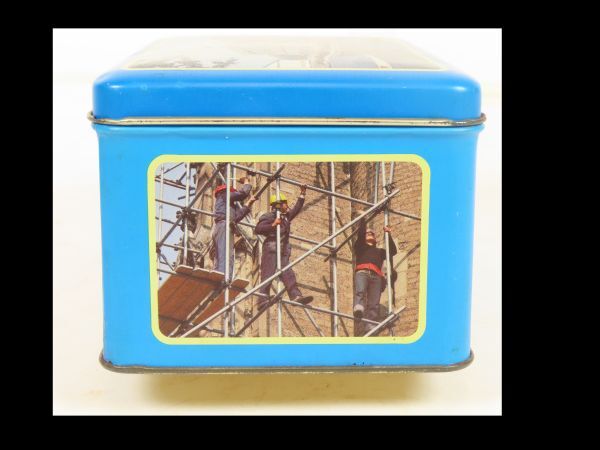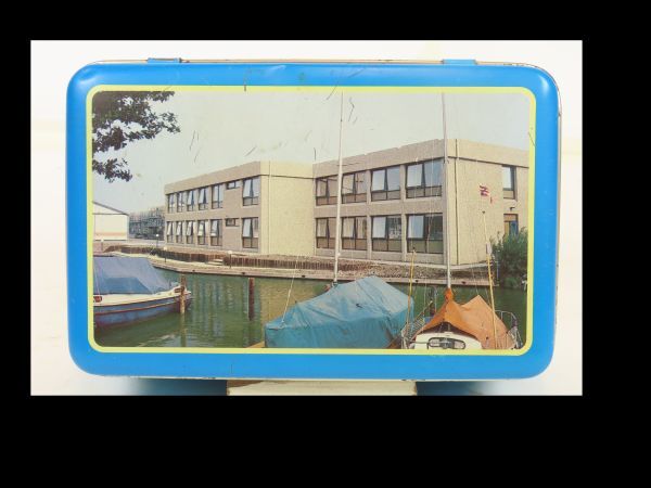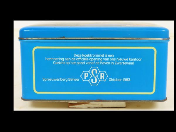Langwerpig koekblik met scharnierend deksel ter gelegenheid van de opening gebouw Spreewenberg beheer in oktober 1983. Het blik is gedecoreerd met afbeeldingen van het gebouw.