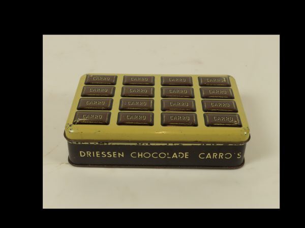 Chocolade bruin blik, met geel deksel waarin zestien bruine rechthoeken voorzien van tekst CARRO