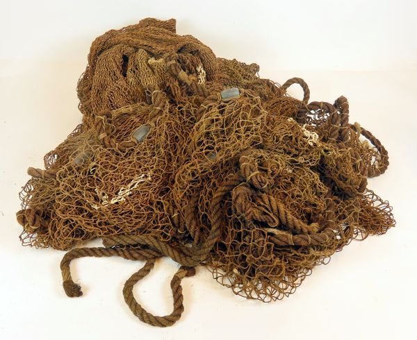 Visnet in de vorm van een fuik, verzwaard met 15 bolletjes lood om het net op de bodem te houden.