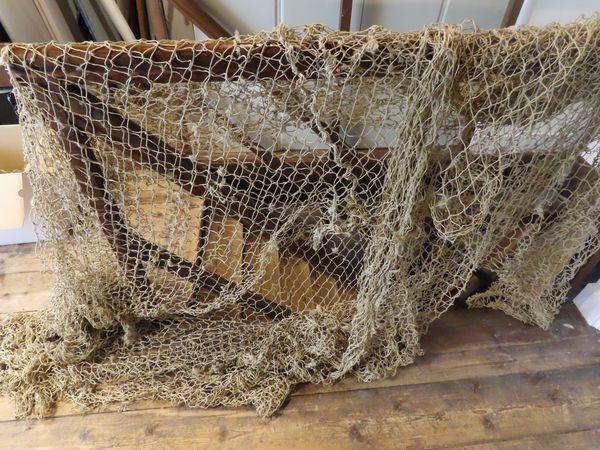 Grofmazig bruin visnet. Het betreft hier een deel van een zogeheten trawlernet dat werd gebruikt voor reparatie van andere netten.