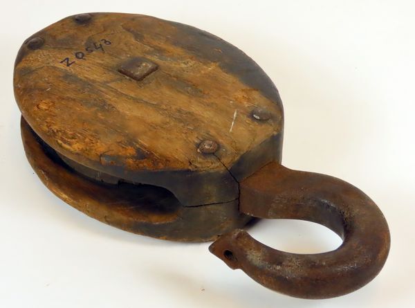 Houten eenschijfs-takelblok met houten katrol en metalen hijshaak. De punt van de haakl is pijlvormig met daarin een ronde opening. Het geheel wordt bij elkaar gehouden door vier metalen pinnen.