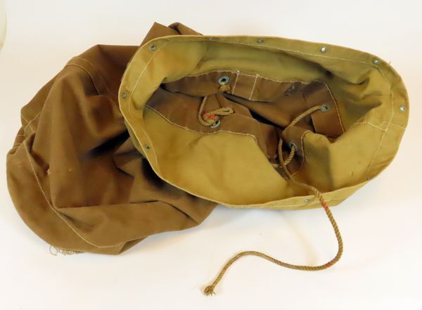 Cilindervormige tas, ook wel aangeduid als plunjezak of plunjebaal gemaakt van canvas. Aan de binnenzijde is zo'n 15 cm onder de bovenrand een sluiting aangebracht met een touw en 8 metalen ringen. In de bovenrand van de tas zitten 12 kleine metalen ringetjes.