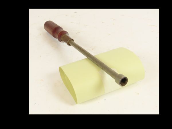 Schroevendraaier, zijnde een dopschroevendraaier of soksleutel met houten handvat voor schroeven en bouten met een zeskantige kop van 9 mm.