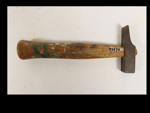 Hamer met kleine kop en grote houten steel en op de steel verfvlekken.