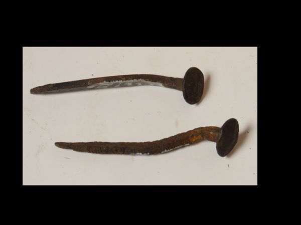 Twee handgesmede ijzeren nagels.