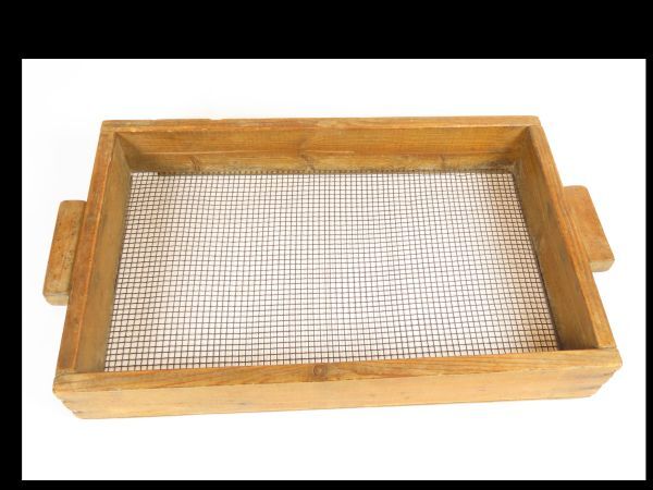 Metalen zeef in houten raamwerk met houten handvaten voor het uitzeven van kolenas.