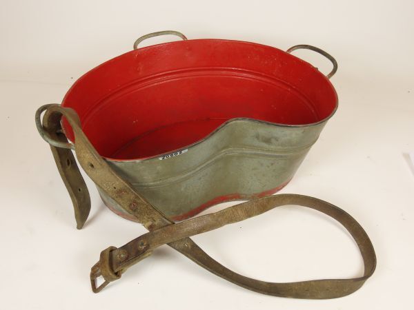 Metalen bak, zijnde een zaaibak, met drie handvatten en ingedeukte voorkant. Binnenkant menierood. Voorzien van een leren riem met gesp.