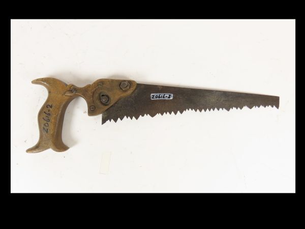 Zaag zijnde een handzaag met verwisselbaar zaagblad. Blad bevestigd met 2 bouten/ moeren. Handvat bestaat uit 2 delen,aan elkaar bevestigd met drie schroeven. Deze zaag wordt ook wel een schrobzaag genoemd.