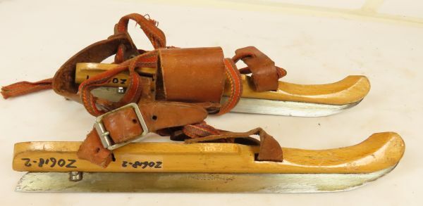 Een paar schaatsen van het type Friese doorloper, voorzien van lederen vastbindriempjes.