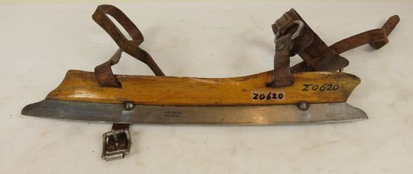 Paar houten schaatsen van het type Friese doorloper, met leren wreef- en hielriempje.