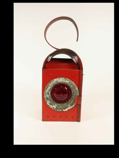 Seinlamp, roodgeverfd, met handvat/hangbeugel. Voorzien van 2 rode lampglazen aan 2 zijden en 1 wit lampglas aan voorzijde. Aan de achterzijde zit een deurtje.
