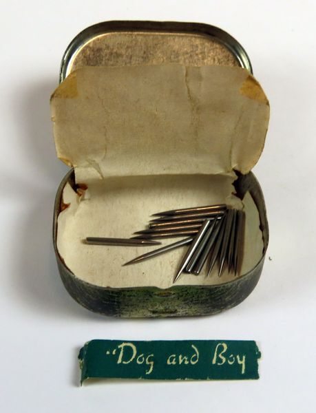 Doosje met 12 metalen grammofoonnaalden van het merk Dog and Boy. Op het deksel een lithografische afdruk van een hond en een kind die elkaar een poot/hand geven. Daarboven de tekst DOG AND BOY BRAND NEEDLES. Onder de afbeelding de tekst REGISTERED TRADE MARK.