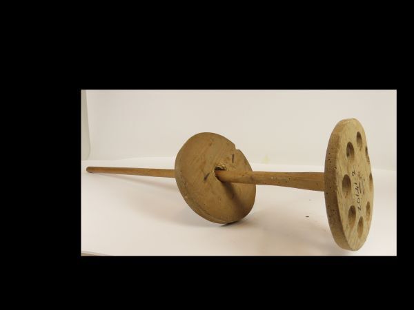 Houten karnstok met twee houten ronde plaatjes, de onderste plaat voorzien van 8 gaten, de plaat daar boven is voorzien van één gat, verschuivend over stok.
