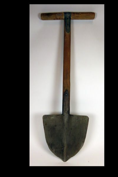 Metalen spade gebruikt voor het afsteken van slootkanten, ook wel aangeduid als korte kantspade. De steel is met vier nagels in de spade bevestigd. Het handvat is met een metalen band en 11 nagels op de steel bevestigd. Blad loopt uit in een punt.