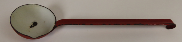 Rood geëmailleerde pollepel met een schenktuitje voor het opscheppen van jus en sausen. De binnenkant van het schepdeel is wit geëmailleerd. De steel is aan het einde omgebogen voor het ophangen.