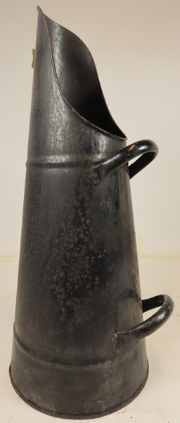 Grote metalen kan, naar boven taps toelopend, voor het bewaren van (steen- of eier)kolen met twee handvaten aan de voorzijde.
