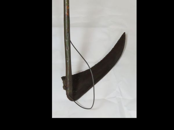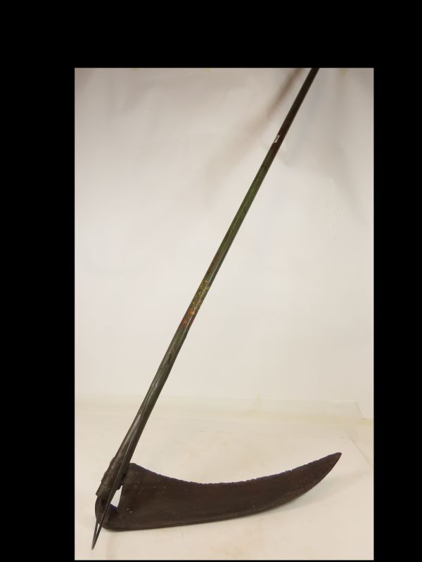 Zeis met metalen steel en onderaan boven het mes een metalen beugel voor het maaien van gras Het uiteinde van de steel is over 15 cm van hout.