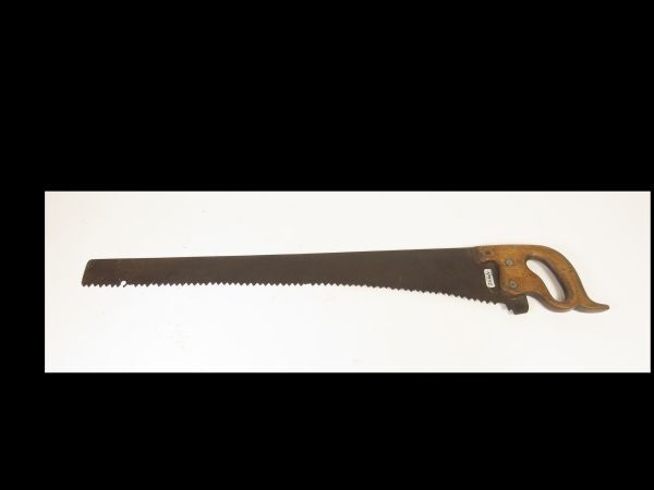 Zaag, zijnde een lange metalen handzaag, grof getand, met houten handgreep.