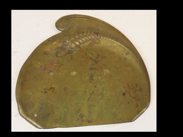 Half ronde metalen plaat. Bewerkt met een afbeelding van een hagedis met staart in het bovenste gedeelte van het blik.( de handgreep) Is gebruikt als blik ( van stoffer en blik )