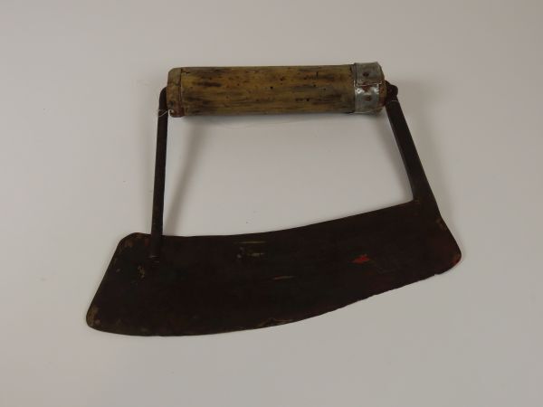 Mes gebruikt bij de oogst van bieten voor het afsnijden van de koppen. Houten handvat vastgezert met metalen ring.