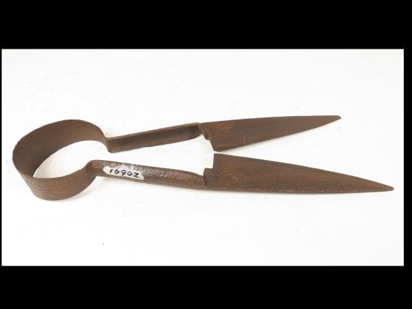 Schaar die uit één stuk gehard staal bestaat in een U-vorm is gebogen. De schaar wordt gebruikt om schapen kort te knippen.