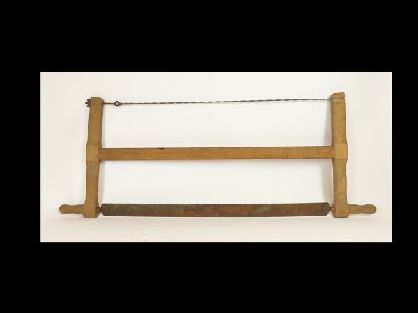 Houten rechthoekige zaag, zijnde een spanzaag. Aan de bovenzijde voorzien van gedraaid metalen draad. Aan de onderzijde een metalen zaagblad.